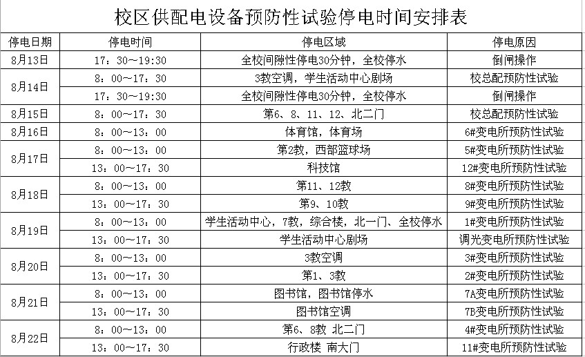 根据供电部门的要求,定于2010年8月14日-22日对校区供配电设备进行预防性试验,届时会出现停电停水现象,希望大家做好相关准备,并注意安全用电用水。我们将尽可能缩短停电停水时间,请大家予以配合,谢谢大家!(具体安排见下表)。联系电话:18957138210 联系人: 刘菊权